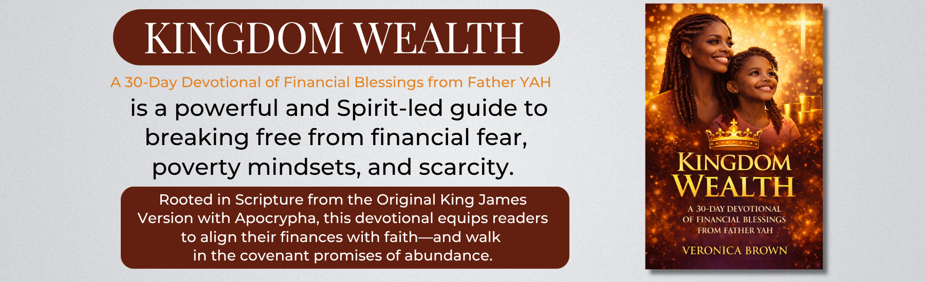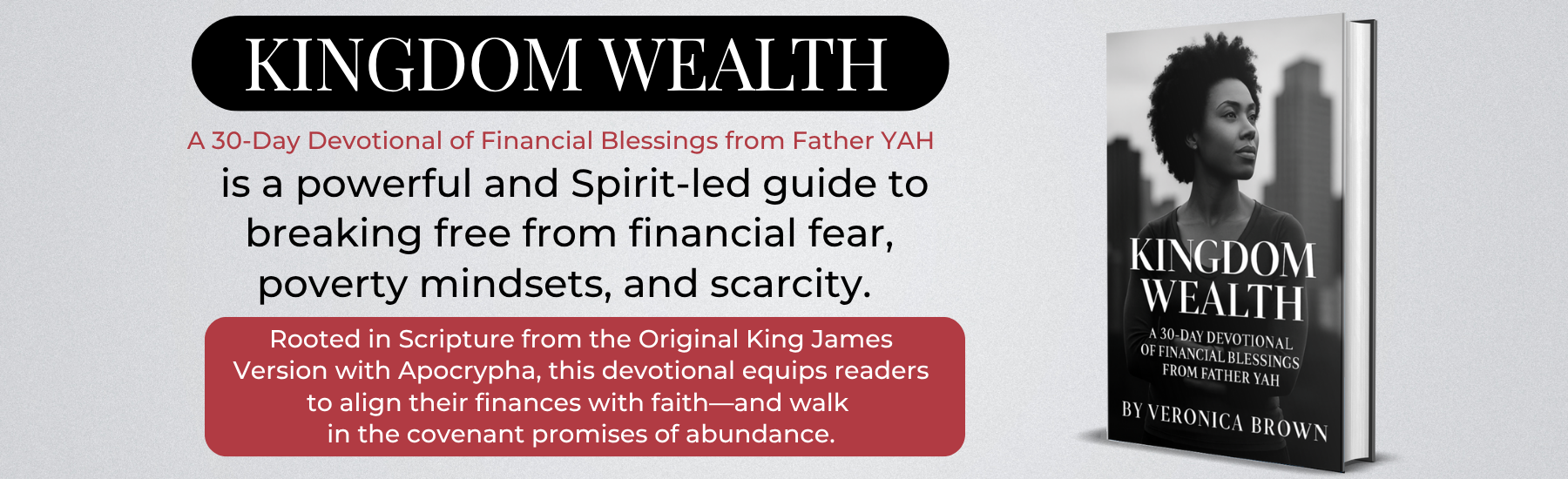 Kingdom Wealth: Financial Blessings from Father YAH by Veronica Brown is a Spirit-led 30-day devotional designed to help you break free from financial fear, poverty mindsets, and scarcity—and step boldly into the abundance that God has promised.